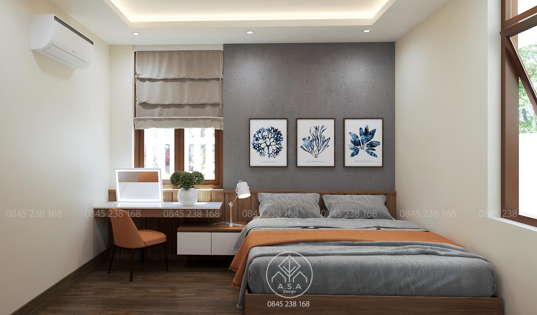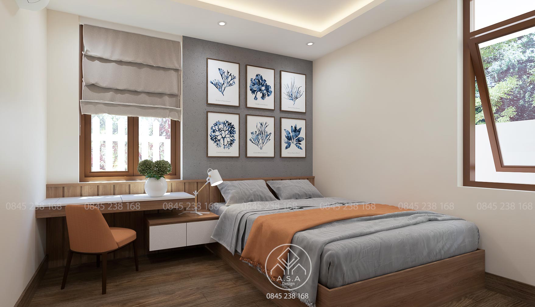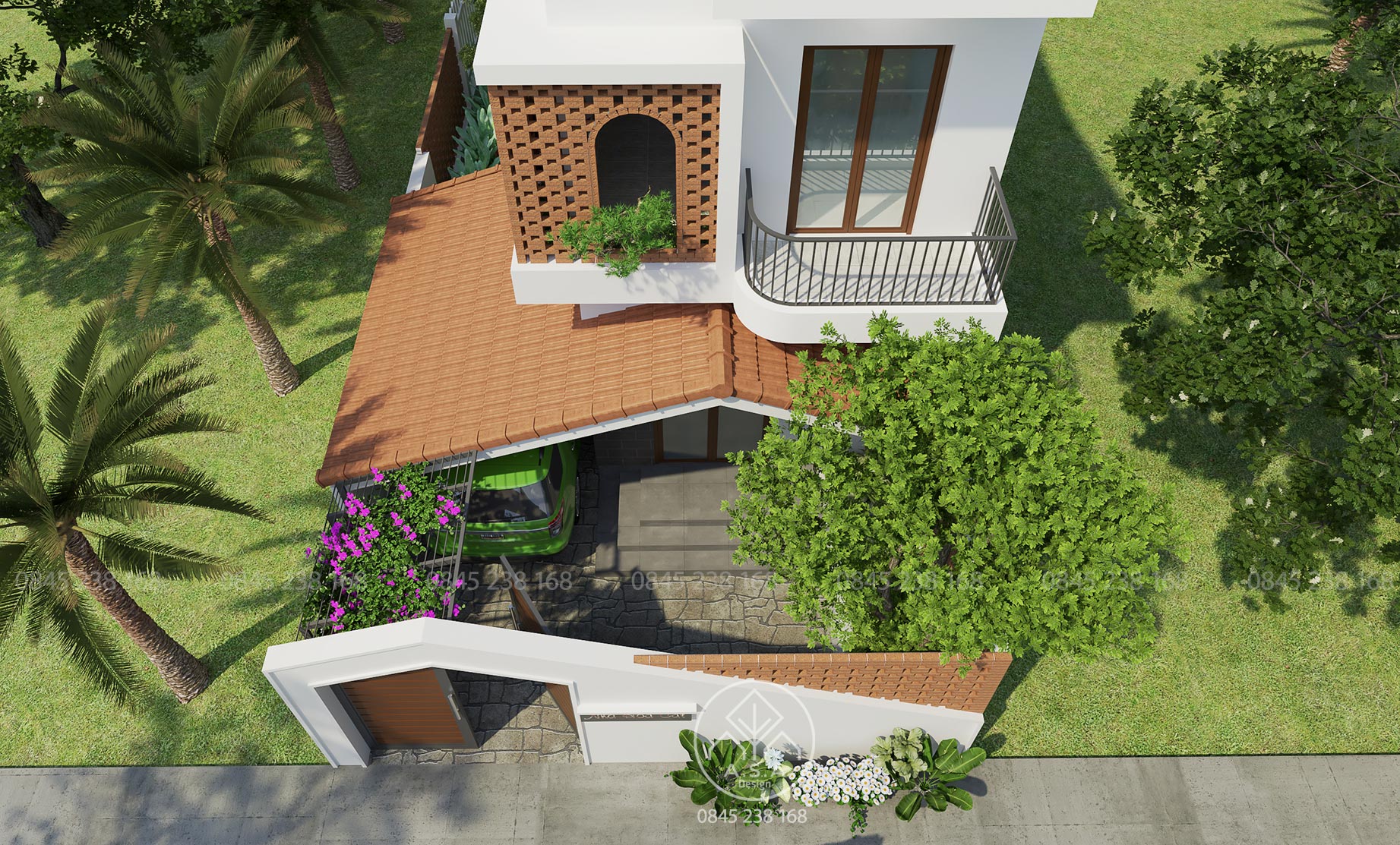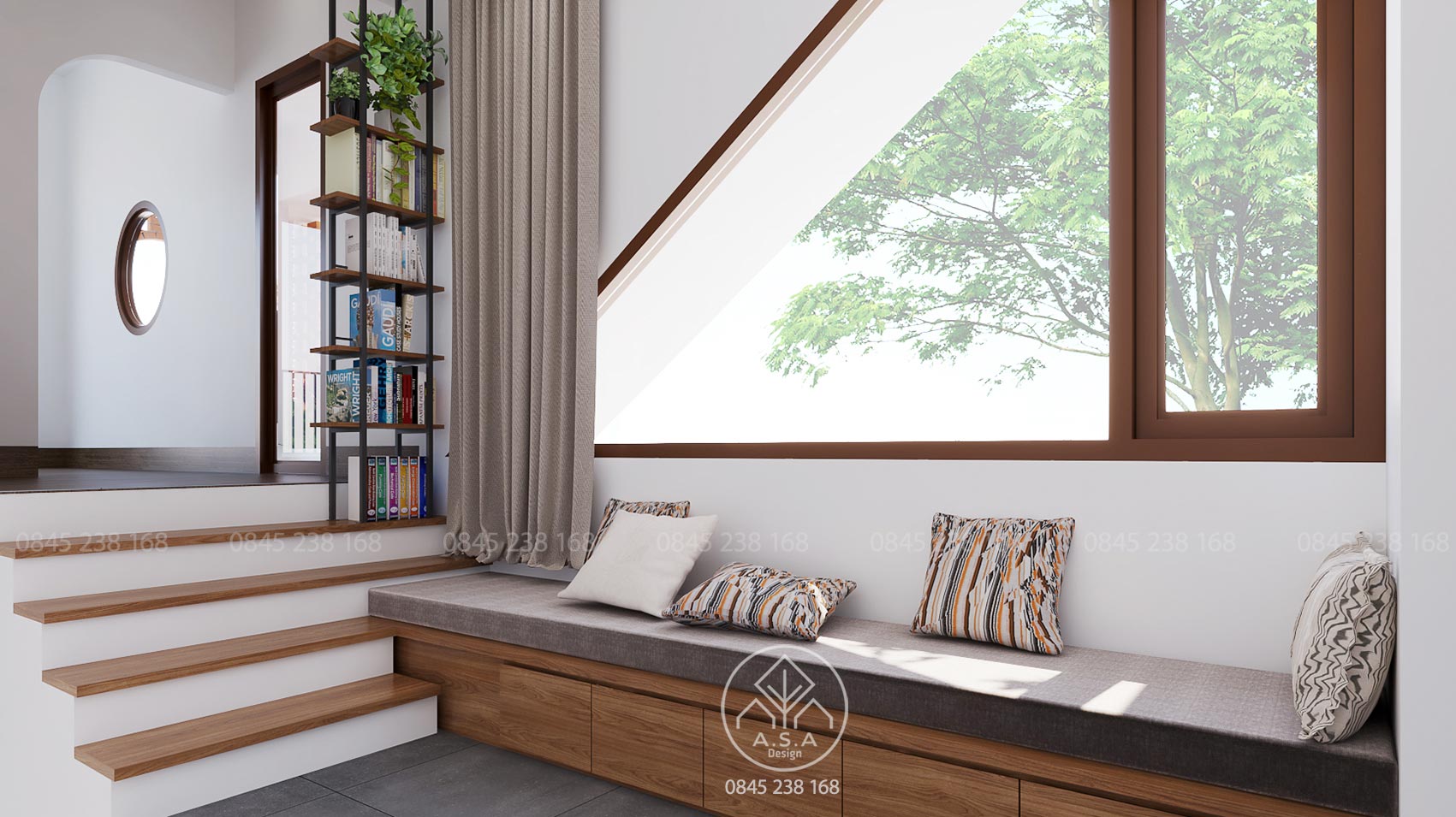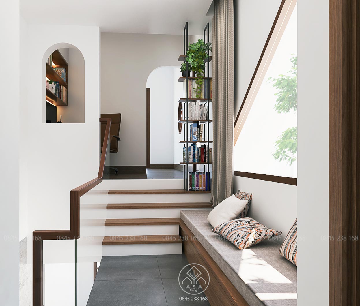 Có thể nói tầng lầu là nơi có nhiều không gian để chill, thư thái nhất. Phòng thờ phía trước thanh tịnh và tách biệt với 2 phòng ngủ hoàn toàn thông qua hành lang tiếp cận của cầu thang. Một chiếc bay window để nằm đọc sách nhìn ra khoảng sân giữa yên bình và lãng mạn. Từ chổ làm việc bước ra một ban công được bao che bởi tường gạch lỗ có nhiều hoa cỏ bên dưới là một không gian để thư giãn hấp dẫn khác. Khi ngồi làm việc lâu có thể đứng dậy ra đây để hít thở và nhấm 1 ngụm trà ấm cũng thật tuyệt vời. Và chưa hết khi từ không gian này có 1 cầu thang để bước lên 1 không gian thư giãn khác cũng rất là chill.