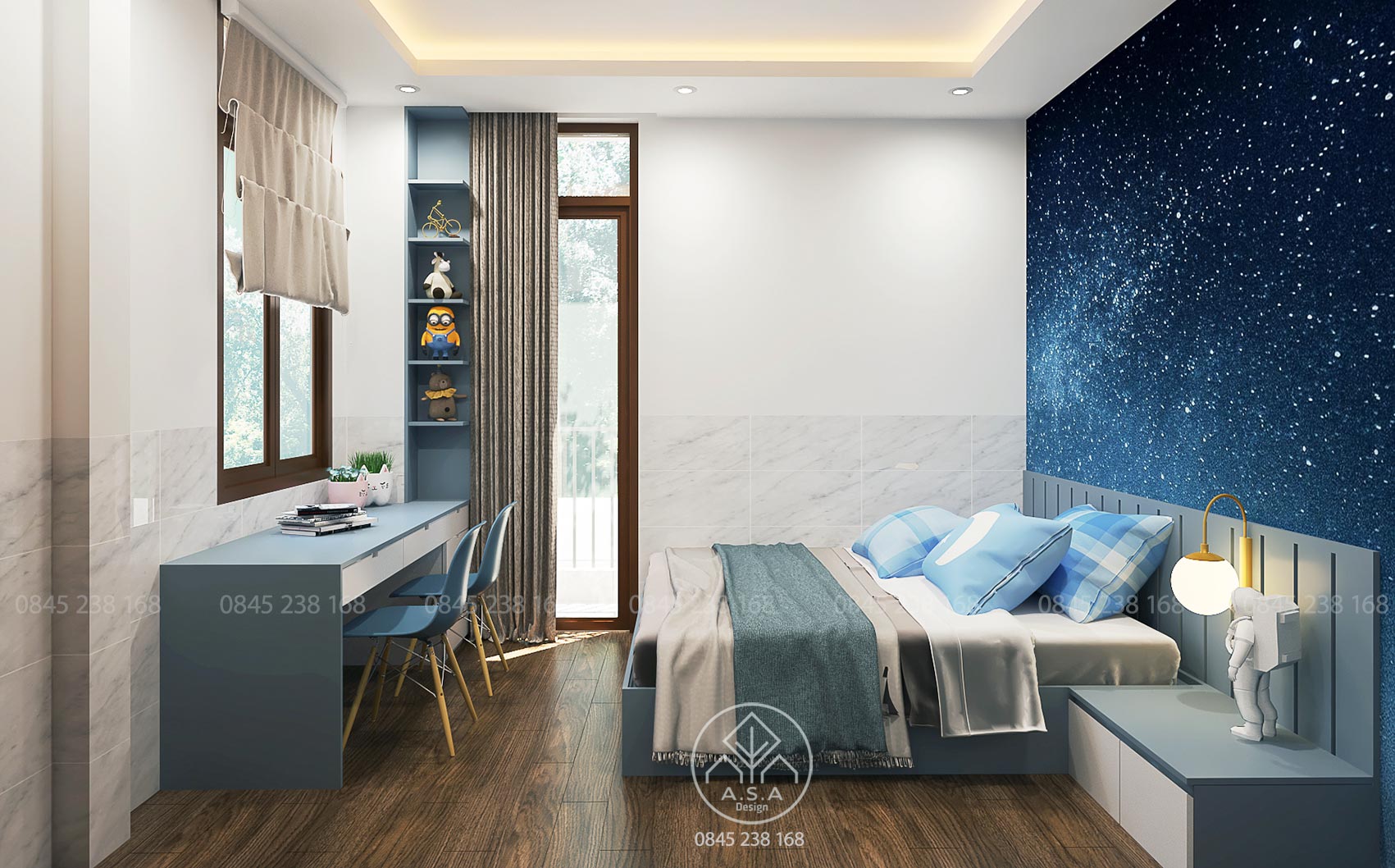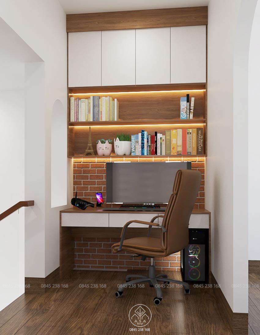 Lầu 1 được bố trí 2 phòng ngủ của 2 cậu con trai, phòng thờ, 1 không gian làm việc của chị chủ nhà, 1 không gian thư giãn bên ngoài và 1 vệ sinh.